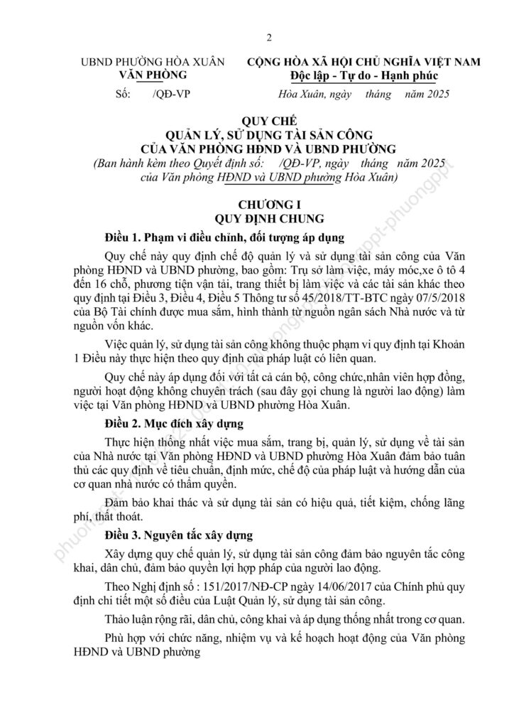 Điều 1. Ban hành kèm theo Quyết định này: Quy chế quản lý và sử dụng tài sản công của Văn phòng HĐND và UBND phường Hòa Xuân.
