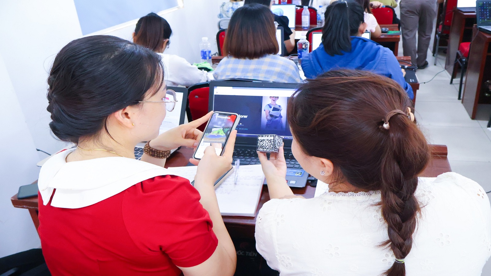 Ngoài việc cung cấp kiến thức nền tảng, chương trình còn chú trọng yếu tố thực hành. Giáo viên được trực tiếp thao tác trên máy tính và thiết bị di động để thiết kế website học tập, tạo video kể chuyện, xây dựng sách điện tử tương tác, chuyển đổi nội dung từ sách giáo khoa sang các sản phẩm số sinh động, phục vụ công tác giảng dạy trên lớp.