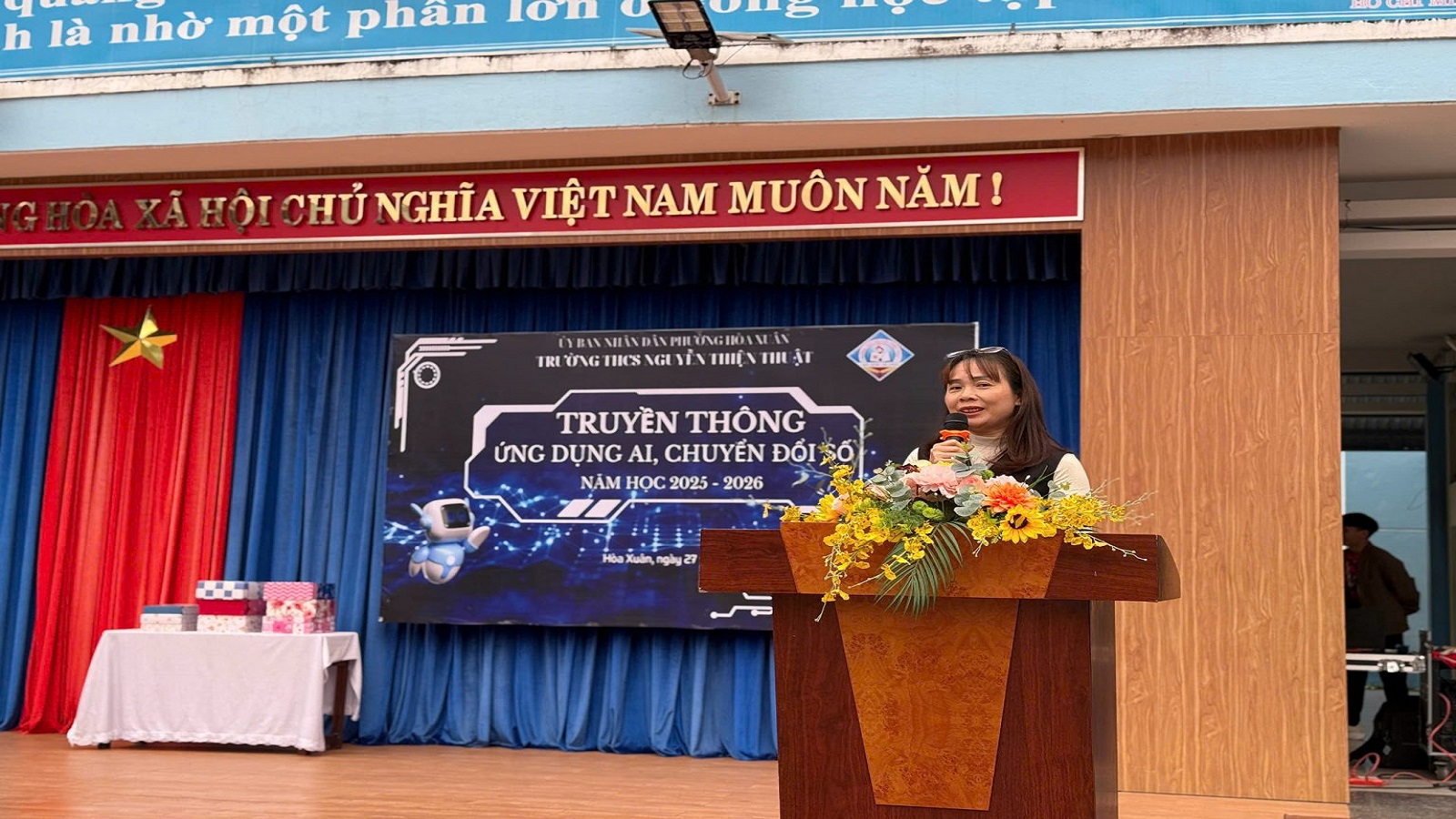 Trong bối cảnh cuộc Cách mạng công nghiệp 4.0 phát triển mạnh mẽ, chuyển đổi số đang trở thành yêu cầu tất yếu của ngành giáo dục. Với mục tiêu đưa công nghệ hiện đại đến gần hơn với học sinh, đồng thời xây dựng môi trường học tập đổi mới, sáng ngày 1/12/2025, UBND phường Hòa Xuân phối hợp với Trường THCS Nguyễn Thiện Thuật đã tổ chức Ngày hội “Chuyển đổi số – Ứng dụng AI trong học đường”, mang đến nhiều hoạt động trải nghiệm sáng tạo, bổ ích và giàu ý nghĩa giáo dục cho học sinh.