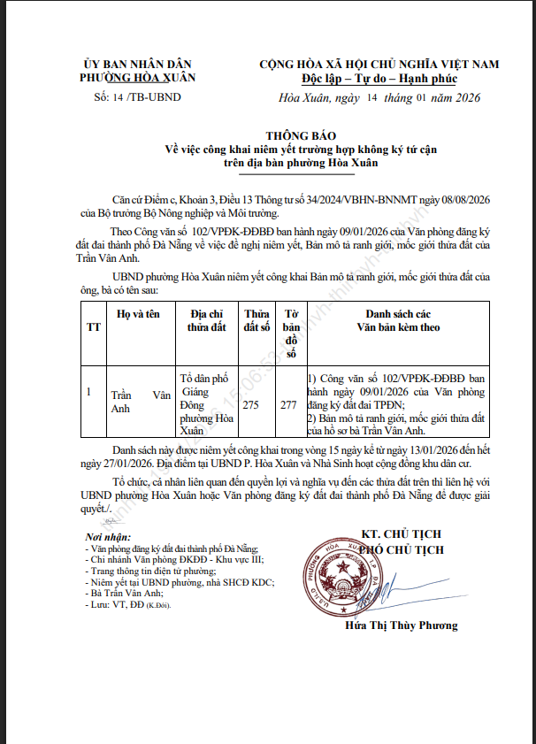 THÔNG BÁO Về việc công khai niêm yết trường hợp không ký tứ cận trên địa bàn phường Hòa Xuân