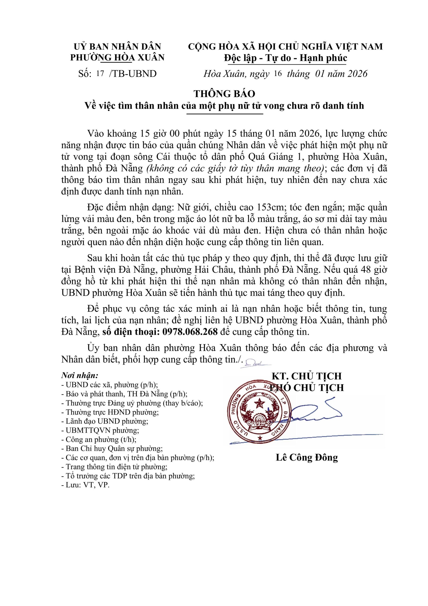 THÔNG BÁO Về việc tìm thân nhân của một phụ nữ tử vong chưa rõ danh tính